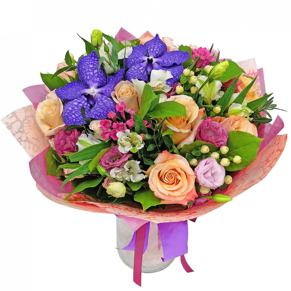 Ванда, альстромерия, гиперикум, роза одноголовая, эустома, эвкалипт.