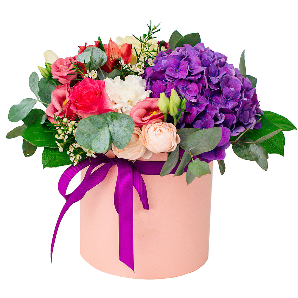 Гортензия, роза кустовая пионовидная, эустома, роза одноголовая, альстромерия, эвкалипт.